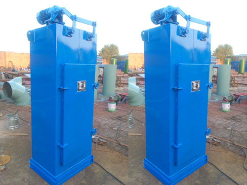 含尘气体由进气口进入灰斗或通过花板孔两种方式进除尘滤袋。含尘气体透过除尘滤袋变为净气,进入箱体,再经箱体上部排放口,由风机排走。粉尘积附在除尘滤袋内表面且不断增加,使袋式除尘器的阻力不断上升,当阻力上升到约1500pa时,为了使袋式除尘器继续工作,需定期滤袋上的粉尘,具体清灰时,选关闭顶上风机,启动摇动电机,由于摇动电机上偏心作用,带动连杆使摇动轴左右来回转动。除尘滤袋就呈波纹状态,使粉尘掉下,卸出待清灰完即停止摇动电机,重新启动风机,使袋式除尘器重新开始工作,上述动作是通过控制仪来自动控制完成的。