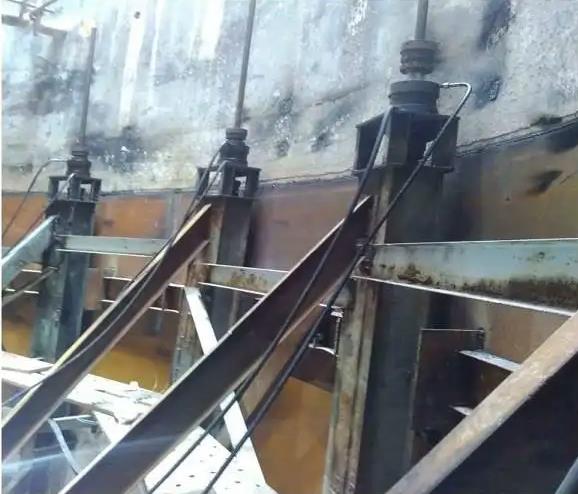 (3)提升杆贯穿上下卡头、提升滑块,并用CHE507焊条将端块与提升杆焊牢。在插入提升杆之前,应对提升杆进行校直。在插入提升杆时,将千斤顶处于松卡位置,即在上、下卡头的松卡螺母上旋到位时进行。注意保证提升杆与千斤顶基本同心,待正式工作时再将上、下卡头复位,使其处于工作状态。在滑道、滑块上均匀涂抹铿基脂二硫化钥润滑油脂。