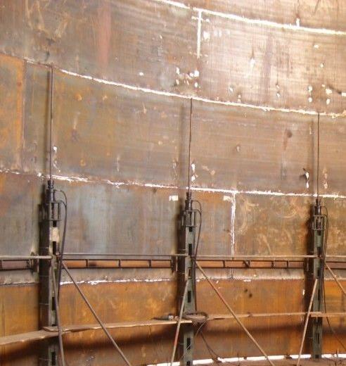 液压顶升设备支架总成施工方法有以下六种:液压提升倒装、中心柱倒装,充气顶升倒装、水浮倒装、正装法、机械顶升倒装。在先期施工的罐底板上安装数个固定垫墩 (400mm 高 , 间距 3-4 米 ), 然后组装 层壁板和顶盖板 , 沿罐内壁 400mm 处均布数台(根据计算确定)液压提升机,以提升机的滑动托架托住固定在罐内壁的胀圈下部 , 操纵液压提升机的控制柜,集中控制各液压机的动作.
