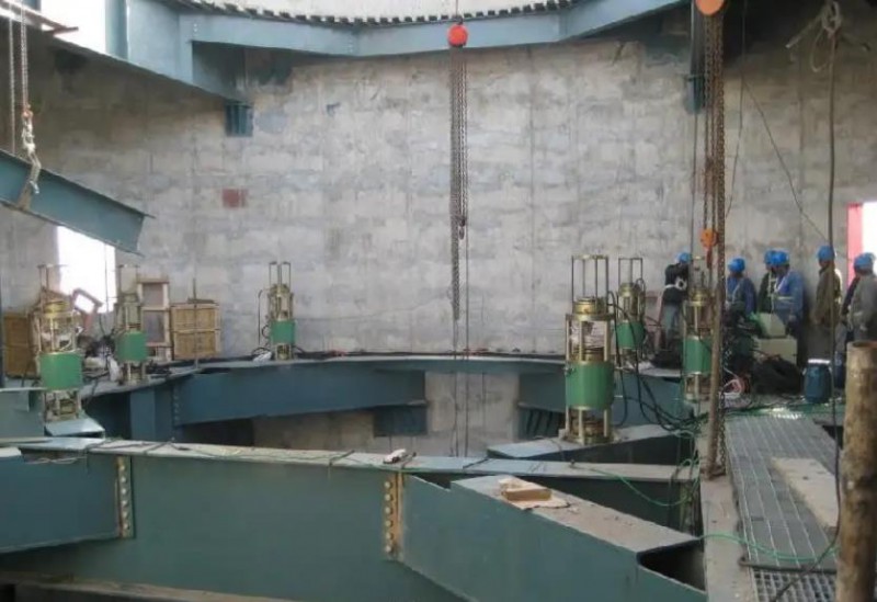 液压顶升设备支架总成施工方法有以下六种:液压提升倒装、中心柱倒装,充气顶升倒装、水浮倒装、正装法、机械顶升倒装。在先期施工的罐底板上安装数个固定垫墩 (400mm 高 , 间距 3-4 米 ), 然后组装层壁板和顶盖板 , 沿罐内壁 400mm 处均布数台(根据计算确定)液压提升机,以提升机的滑动托架托住固定在罐内壁的胀圈下部 , 操纵液压提升机的控制柜,集中控制各液压机的动作.