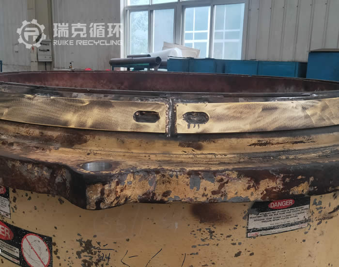 下面为栾川某矿山企业送修的美卓HP300下架体部,经技术部门检测主要维修项为,架体连接处座衬更换,座衬为连接架体的垫板其材料为铜件。长期使用会导致变形脱落,对主机风整体稳定性产生影响。其次定位销产期使用后会导致拉偏,重新更换导向定位销,补焊安装内孔重新加工内孔进行冷冻安装,以保证其坚固程度。