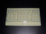 四、针剂托盘:是一采用材料的吸塑托盘,该材料表面的电阻值小于10的11次方欧姆。主要用于电子、IT产品的吸塑托盘。