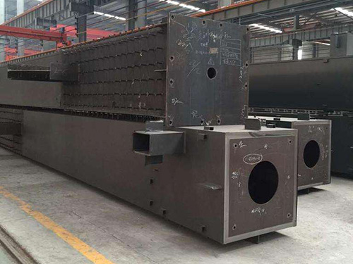 箱型柱下料采用数控火焰切割机进行柱板切割,开坡口方法为碳弧气刨切割K型坡口,下料完成后进行调直校正,为让柱身板拼装准确,需制备组装胎膜,组装顺序为:先以上盖板为基准,然后放出横隔板与侧腹板的装配线,进行U型组立,然后组装下盖组装完成后进行焊接,柱身主体焊接采用埋弧自动焊,加劲板焊接采用电焊机手工焊接,然后一面隔板焊接电渣压力焊接的方法进行,焊接设置引弧板。箱形柱焊接完成后进行调直矫正,后用端头铣床进行端头切割。箱形柱涂装严格按标准除锈、刷油,箱形柱制作完成后由专职质检人员进行检验、编号。