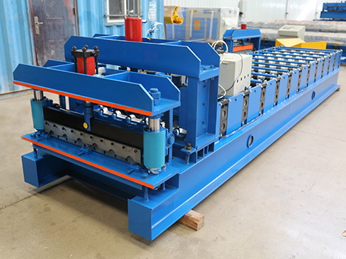 琉璃瓦成型机分为三部分,辊道成型部分、压型部分、切刀部分。辊道成型部分是由电机拖动,链条带动各辊转动。压型部分是液压缸带动模具上下移动,可以把彩钢压成许多节,形似琉璃瓦。切刀部分是液压缸带动刀具上下移动,可以把彩色钢瓦切断。琉璃瓦成型机的生产过程如下:彩色钢板进入辊道成型部分,成型后到压型部分,压成等距离一节一节的,切刀负责定长切割。