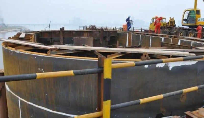 ⑤焊接完毕的水平环口焊缝,经焊缝外观检查及超声波抽检达到质量要求后,对焊缝进行油漆涂刷。