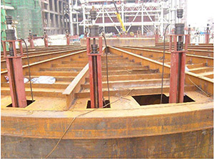 液压顶升设备的安装及操作是整个储罐倒装施工的,采用此方法倒装施工储罐安全可靠,可降低劳动强度,提高劳动效率。顶升装置可多次使用,多次施工经济,因此对于储罐施工,建议采用液压顶升装置进行提升施工。