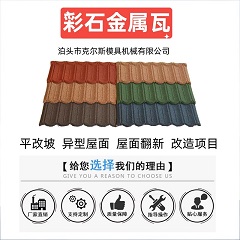 河北嘉烨建材有限公司(http://www.hbjyjcgs.com/)常年供应生产彩石金属瓦设备、彩石金属瓦生产设备、彩石瓦设备等,彩石金属瓦模具,各种瓦型模具,并研讨成功的【KES-1650】彩石瓦设备自动控制生产线。本公司常年供应彩石金属瓦、金属瓦、彩石瓦、彩石钢瓦、多彩蛭石瓦、金属屋面瓦、彩石金属瓦是采用比好的技术生产的,彩石金属瓦是一款新型的屋面建筑材料,可适用于木屋架,钢构架,全钢网架,混凝土屋面等,是一款适用于各种屋面的瓦片。彩石金属瓦不仅适用于南方湿度大的城市,还能适应北方寒冷气候。