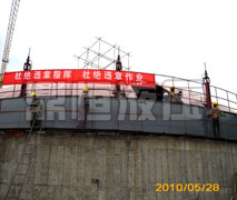 回油时,压力油通过高压油管从千斤顶的上油嘴进入,此时千斤顶的下卡头锚片锁紧提升爬杆静止不动,在油压作用下,千斤顶的活塞回程,液压油从千斤顶的下油嘴排出。至此,千斤顶的活塞完成一个提升行程(20cm)。如此往复循环,千斤顶通过提升爬杆、环形抱箍带着重物不断提升。如此反复,直至完成烟囱钢内筒的全部提升安装工作。