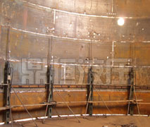 液压提升设备提升原理利用液压提升装置均布于储罐内壁圆周处,先提升罐顶及罐体的上层壁板,然后逐层组焊罐体的壁板。采用自锁式液压千斤顶和提升架、提升杆组成的液压提升机,当液压千斤顶进油时,通过其上卡头卡紧并举起提升杆和胀圈,从而带动罐体向上提升;当千斤顶回油时,其上卡头随活塞杆回程,此时其下卡头自动卡紧提升杆不会下滑,千斤顶如此反复运动使提升杆带着罐体不断上升,直到预定的高度。当下一层壁板对接组焊后,打开液压千斤顶的上、下松卡装置,松开上下卡头将提升杆以及胀圈下降到下一层壁板下部胀紧、焊好传力筋板,再进行提升。如此反复,使已组焊好的罐体上升,直到后一层壁板组焊完成,从而将整个储罐安装完毕。