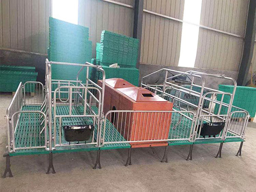 母猪产床主要由母猪定位架、仔猪围栏、仔猪保温箱、漏粪地板、母猪食槽和小猪补料槽等组成。母猪定位架的作用是控制母猪自由活动区域和躺卧方式,母猪产床定位架之间有挡杠,避免仔猪被压死、踩死和压伤。定位架的长度一般为2.1-2.3米,宽度为0.6米,高度为1.0米。限位架下边的一根栏杆上面焊有弯曲的档柱,用以保护仔猪,而不影响仔猪吃奶。母猪食槽和饮水器都在定位架的前方。仔猪围栏是为仔猪提供一个活动的空间,并防止跑出去。围栏有栅条式和隔板式两种。栅条式有利于通风和观察,但不利于防疫。隔板式有利于防疫但造价较不错,仔猪围栏的长为2.0-2.3米,宽为1.7-1.8米,高为0.5-0.6米,栅格间距不大于40毫米,仔猪补料槽和饮水器都装在围栏的后部,供粪便徘在后部的排粪区,猪产床地板由塑料地板和铸铁地板组成。