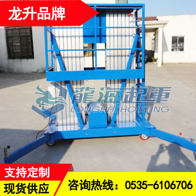 龙海起重龙升牌高空作业平台:单桅、双桅、以及可定制多桅高空作业平台,铝合金材质,轻便灵活,多导向轮机构设计,平台面积大,运转灵活,推行方便,升降平稳自如,有应急下降开关,在缺电情况下平台缓慢下降。且选用高质量液压密封件和原装成套液压泵站,质量有保障!