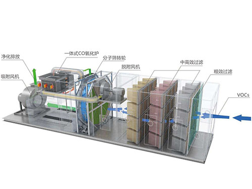本工艺采用沸石分子筛吸附净化,配以热空气脱附 ,浓缩后的 VOC 采用催化燃烧方式处理,满足达标排放的要求。