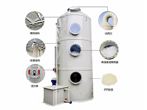 废气净化喷淋塔主要的运作方式是酸雾废气由风管引入净化塔,经过填料层,废气与氢氧化钠吸收液进行,气液两相充足接触吸收中和反应,酸雾废气经过净化后,再经除雾板脱水除雾后由风机排入大气。吸收液在塔底经水泵增压后在塔顶喷淋而下,之后回流至塔底循环使用。净化后的酸雾废气达到地方排放标准的排放要求,低于排放标准。通过集气罩预先将废气收集起来,在风机的作用下将废气源源不断向净化设备输送,再经过通风管道的输送作用,使废气输送到系统的喷淋塔内,气体在喷淋塔塔内经过酸性洗液(碱性洗液)的喷淋洗涤过程,废气中所含有的容易产生恶臭味的气体成份充足与酸性(碱性)水雾接触混合并且发生中和反应,形成好的气液两相交和。经过喷淋后的水雾再在洗涤塔内的填料层内形成一个多孔接触面大的处理层,进一步的对有机废气进行治理。