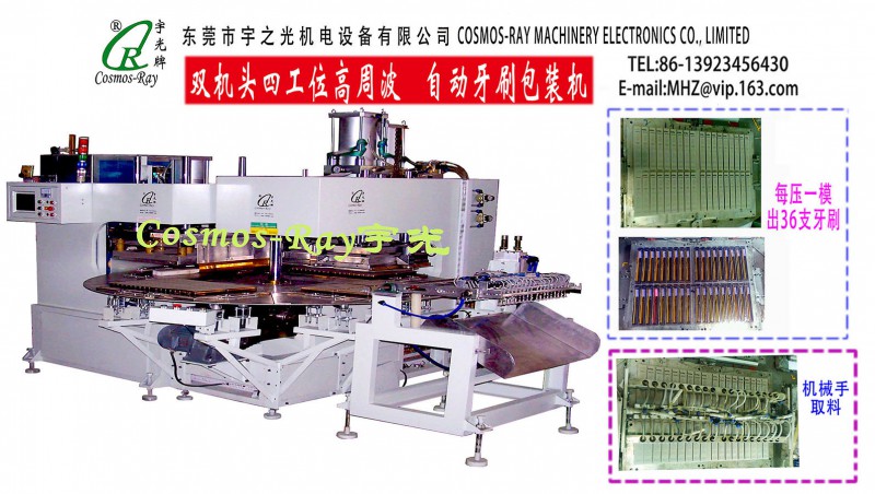 工位自动转盘式牙刷包装专用机,可同时摆放不同规格模具进行生产,无须人工撕边,每压一模出