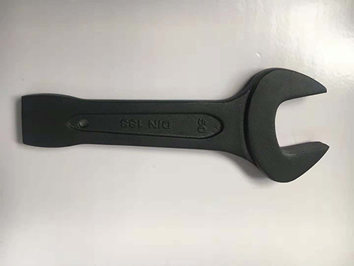 敲击开口扳手成型后经高温发蓝处理,在高含量的亚硝酸钠溶液中,温度140度以上,在钢铁件表面生成致密的氧化膜(Fe2O3及Fe3O4),不同的钢材会有不同的色差,与粗糙度无关;发蓝膜不,故发蓝后要浸防锈油处理。还可根客户要求进行其他表面处理。经过加工处理后的铍青铜材质的敲击开口扳手的抗拉强度能达到35度以上,并且这种材质的产品是既又防磁的产品。铝青铜合金的产品能达到25度以上,根据客户朋友们的不同需求能够满足客户朋友们对敲击开口扳手产品的需求。敲击开口扳手以铝青铜合金和铍青铜合金两种材质为原材料加工生产敲击开口扳手,其中经过多道工序加工处理而成,产品的表面处理有多种形势来供客户朋友们选择,工具产品的表面处理有静电喷涂。