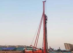 24米长螺旋钻机包括液压步履桩架和钻进系统两部分。桩架采用液压步履式底盘,自动化程度高,可自行行走及360度回转,设有四条液压支腿及一条行走油缸以辅助行走及回转同时增加施工时的整机稳定性,可整机进行转运。立柱为可折叠式箱型立柱,法兰连接方式,立柱采用两块高厚度锰板并且用大型折弯机折弯技术,长螺旋钻机经两道焊缝焊接而成同时立柱内部每隔60cm加焊四根加强筋固定,增加立柱抗扭抗弯性。立柱由两条变幅液压油缸控制其起降。钻进系统包括动力头与钻具,动力头的输出轴与螺旋钻具为中空式,桩机采用长螺旋成孔,可通过钻杆中心管将混凝土(泥浆)进行泵送混凝土CFG桩施工,即能钻孔成孔一机一次完成,也可用于干法成孔、注浆置换改变钻具后还可采取深层搅拌等多种工法进行施工。